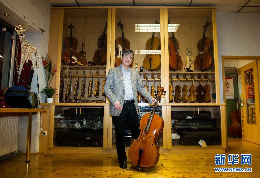 12月17日,在奥地利维也纳,宋翰在自己的工作室。维也纳是世界闻名的音乐之都,来自世界各地的音乐家带着他们心爱的乐器汇聚于此,为观众奉献出一场场精彩的表演。在每场精彩的音乐会背后,都离不开制琴师的鼎力支持,他们让每把乐器绽放出应有的光彩。维也纳华人提琴制作大师宋翰就是他们中的一员,他和妻子尚志红进入当地制琴行业已近30年。宋翰从小接受良好的音乐教育,1979年考入上海音乐学院管弦系大提琴演奏专业和提琴制作专业,后选择以提琴制作为主科,师从中国提琴制作事业的开创者谭抒真先生。1985年,宋翰开始了他在奥地利音乐界的打拼。1994年,经过长达一个月的严格考试后,宋翰在维也纳获得奥地利提琴制作大师的称号,并于次年与同为上音提琴制作专业的妻子尚志红共同创办了自己的提琴工作室。近30年来,夫妻俩的以诚待人和专业素养在业内积攒了口口相传的好口碑,在竞争激烈的音乐之都站稳脚跟,世界各地的音乐家慕名而来。新华社记者钱一摄