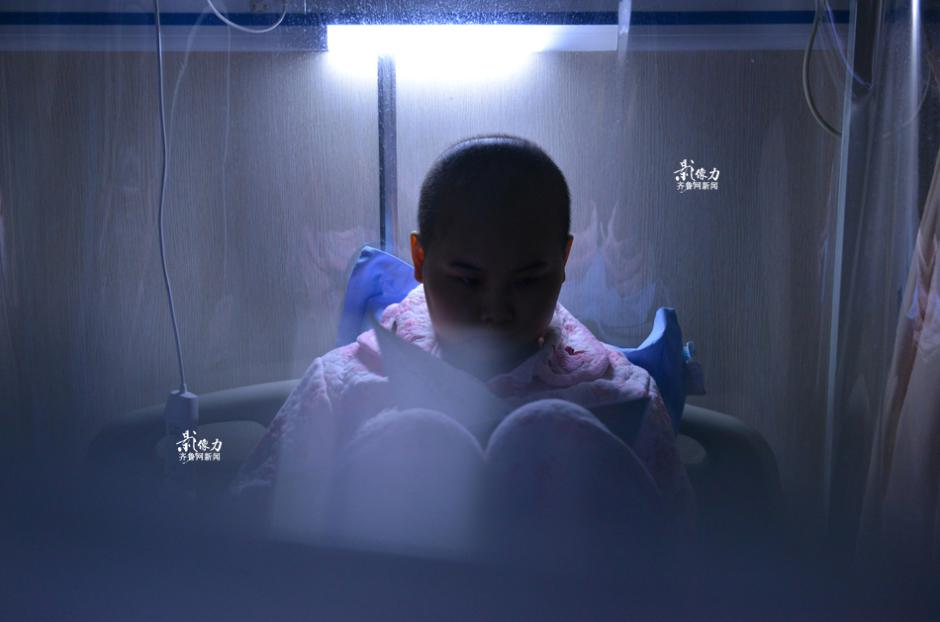 血压低、头晕、吐、浑身疼,每一次化疗都让杜丽媛感觉独立如年。而更让她觉得难过的,则是自己因为患病而给爸爸妈妈带来巨大的痛苦和压力。杜丽媛已经接受6次化疗,25次放疗,一次自体干细胞移植,目前正在进行第7次化疗。作为一个并不富裕的农村家庭,从年初到现在已经在治疗方面花费了40多万,“进口消炎药一袋两三百,每天要打3种消炎药,一天平均要打10袋,加上其他的药,一天花费要4000多块钱。从年初到现在已经花了40多万。”杜丽媛的母亲这样告诉记者。图为杜丽媛在病床上看书。 于鹏 张帅 摄 图片来源:齐鲁网