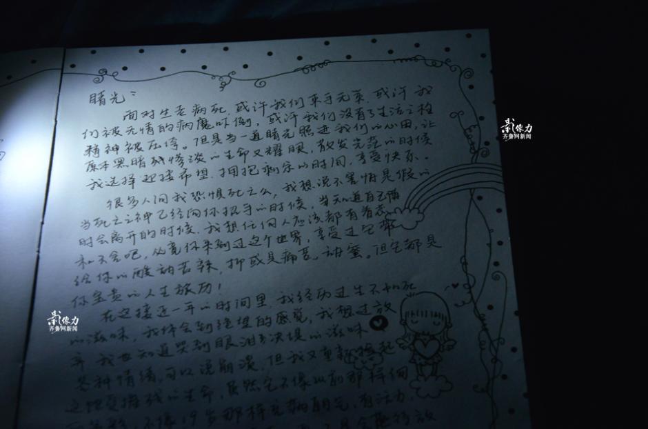 “面对生老病死,或许我们束手无策,或许我们被无情地病魔吓倒,或许我们没有了精神支柱被拖垮,但是当一道晴光照进我们心田,让原本黑暗暗淡的生命耀眼,散发光芒的时候我选择迎接希望,拥抱剩余的时间,享受快乐”。杜丽媛在日记中写到。图为杜丽媛的日记。 于鹏 张帅 摄 图片来源:齐鲁网