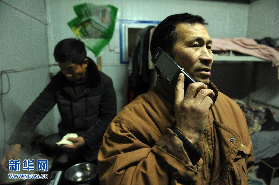 工人蒋兴华在新年到来前夕给家人打电话。由于一直没有讨要到工钱,他已经在工地上等了两个月(2014年12月31日摄)。在家家户户喜迎阳历新年到来的时候,来自四川的邓才云和工友们却依然整日奔走在讨薪囧途上,他们不仅要四处催讨自己一年来的血汗钱,还要在时常断水断电的工地上和寒冷的工棚里坚守等待。 2014年3月份,邓才云、冉国富和谢丽琼等一百多名来自各地的建筑工人来到宁夏回族自治区银川市鼎辉时代城二期项目工地上打工,11月2日,项目正式停工,但邓才云和工友们一年来的血汗钱却始终没有下发。“到现在都快两个月了,我们这里的工友每个人都有将近3万块钱没有发下来!”邓才云告诉记者。这两个月来,他和工友们先后跑了工地项目部、银川市金凤区劳动监察大队和公安局,但始终没能讨要到属于自己的血汗钱,“光跑劳动监察大队就不下十次,但每次都说已经处理了,要我们回去等消息。”12月31日,记者跟随邓才云和工友们再次来到银川市金凤区劳动监察大队,一名陈姓工作人员表示他们已经将此事备案并向银川市公安局金凤区分局反映。随后,工友们来到银川市公安局金凤分局,但是打听了一圈却始终没找到这起案件的负责人。 “我们现在真的没办法了,住的地方还断水断电,有一些人实在坚持不住已经回家去了!”邓才云说,他和其他40多名工友目前还居住在工地的移动板房里,天气越来越冷,工地上经常断水断电。记者在工棚里见到了大白天躲在被窝里的刘俊英,她告诉记者,天气实在太冷,工棚里没有暖气,很多女工白天都不敢下床,“工棚边上有自来水槽,但是水龙头都被冻住了,经常断水,我们都好久没洗澡了!” 12月31日,又跑了一天的工友们带着重重心事再次回到工地,升起了一堆篝火取暖。“等元旦假期一过,我们还得去要钱,要不到钱就不回家过年了!”邓才云说。新华社记者 彭昭之 摄