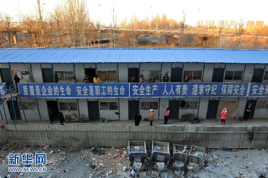 工友们在工地的移动板房等待新年的到来。讨薪的两个月,他们一直住在这里(2014年12月31日摄)。在家家户户喜迎阳历新年到来的时候,来自四川的邓才云和工友们却依然整日奔走在讨薪囧途上,他们不仅要四处催讨自己一年来的血汗钱,还要在时常断水断电的工地上和寒冷的工棚里坚守等待。 2014年3月份,邓才云、冉国富和谢丽琼等一百多名来自各地的建筑工人来到宁夏回族自治区银川市鼎辉时代城二期项目工地上打工,11月2日,项目正式停工,但邓才云和工友们一年来的血汗钱却始终没有下发。“到现在都快两个月了,我们这里的工友每个人都有将近3万块钱没有发下来!”邓才云告诉记者。这两个月来,他和工友们先后跑了工地项目部、银川市金凤区劳动监察大队和公安局,但始终没能讨要到属于自己的血汗钱,“光跑劳动监察大队就不下十次,但每次都说已经处理了,要我们回去等消息。”12月31日,记者跟随邓才云和工友们再次来到银川市金凤区劳动监察大队,一名陈姓工作人员表示他们已经将此事备案并向银川市公安局金凤区分局反映。随后,工友们来到银川市公安局金凤分局,但是打听了一圈却始终没找到这起案件的负责人。 “我们现在真的没办法了,住的地方还断水断电,有一些人实在坚持不住已经回家去了!”邓才云说,他和其他40多名工友目前还居住在工地的移动板房里,天气越来越冷,工地上经常断水断电。记者在工棚里见到了大白天躲在被窝里的刘俊英,她告诉记者,天气实在太冷,工棚里没有暖气,很多女工白天都不敢下床,“工棚边上有自来水槽,但是水龙头都被冻住了,经常断水,我们都好久没洗澡了!” 12月31日,又跑了一天的工友们带着重重心事再次回到工地,升起了一堆篝火取暖。“等元旦假期一过,我们还得去要钱,要不到钱就不回家过年了!”邓才云说。新华社记者 彭昭之 摄