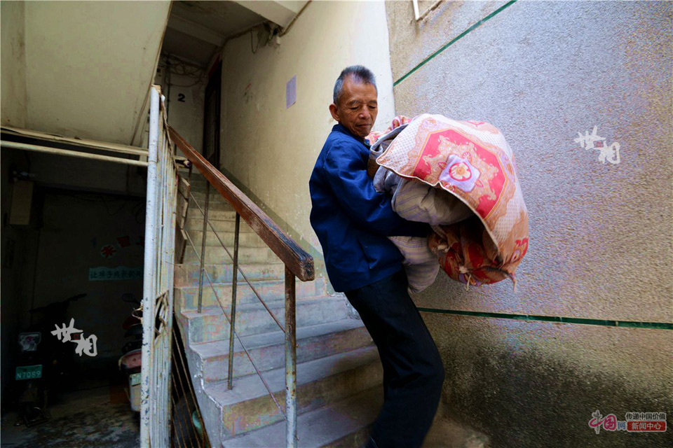 阮权将弟弟阮德华床上的被褥报到楼下大院进行晾晒。尽管很累,但阮权没有怨言,他知道这是他的责任。
