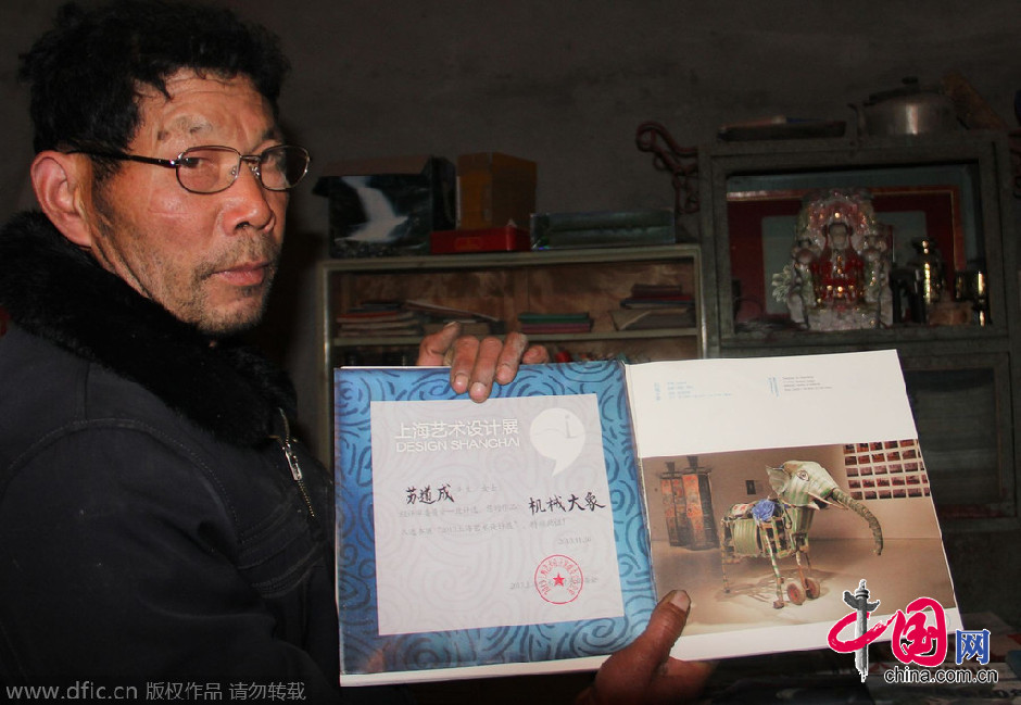 2015年1月18日,湖北省十堰市,郧西县马安镇农民发明家苏道成骑着自己发明的“木牛流马”在街上溜达,引来不少市民围观。“木牛流马”除了四条腿外还安装了两个车轮,车轮作用是“木牛流马”迈腿前行时支撑固定不让它倒下。罗伟 杨洪霞/东方IC