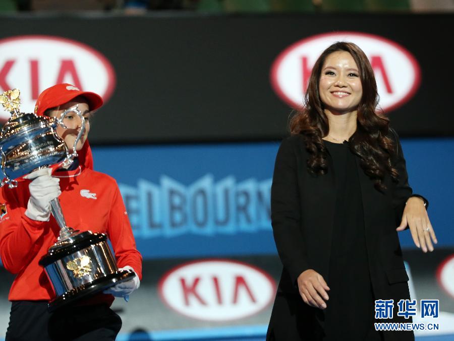1月19日,李娜(右)在澳网球童陪伴下走进罗德拉沃尔球场后向现场观众致意。当日,澳大利亚网球公开赛组委会为上届澳网女单冠军李娜举行了简短的退役仪式。在仪式上,李娜与现场观众分享了自己怀孕的喜讯。新华社记者徐俨俨摄