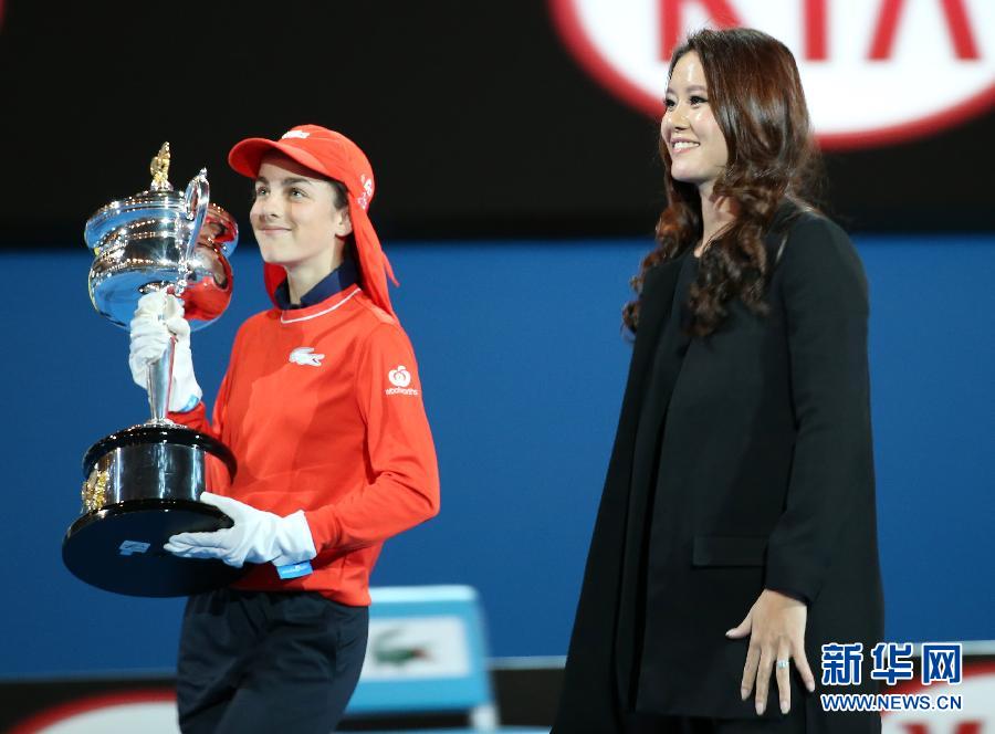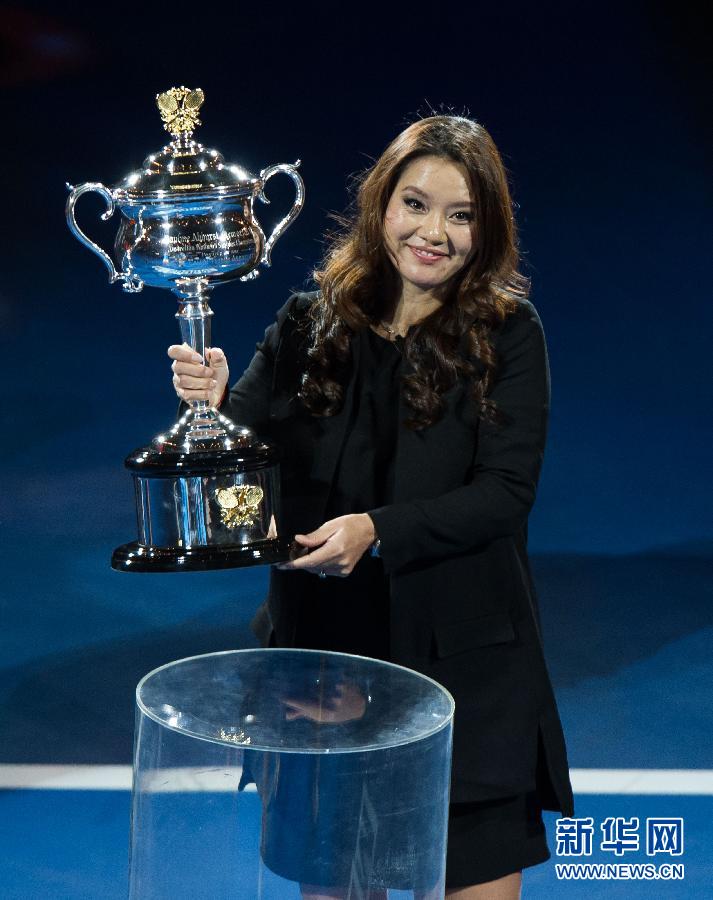 1月19日,李娜在退役仪式上手持澳网冠军奖杯留影。当日,澳大利亚网球公开赛组委会为上届澳网女单冠军李娜举行了简短的退役仪式。在仪式上,李娜与现场观众分享了自己怀孕的喜讯。新华社发(白雪摄)