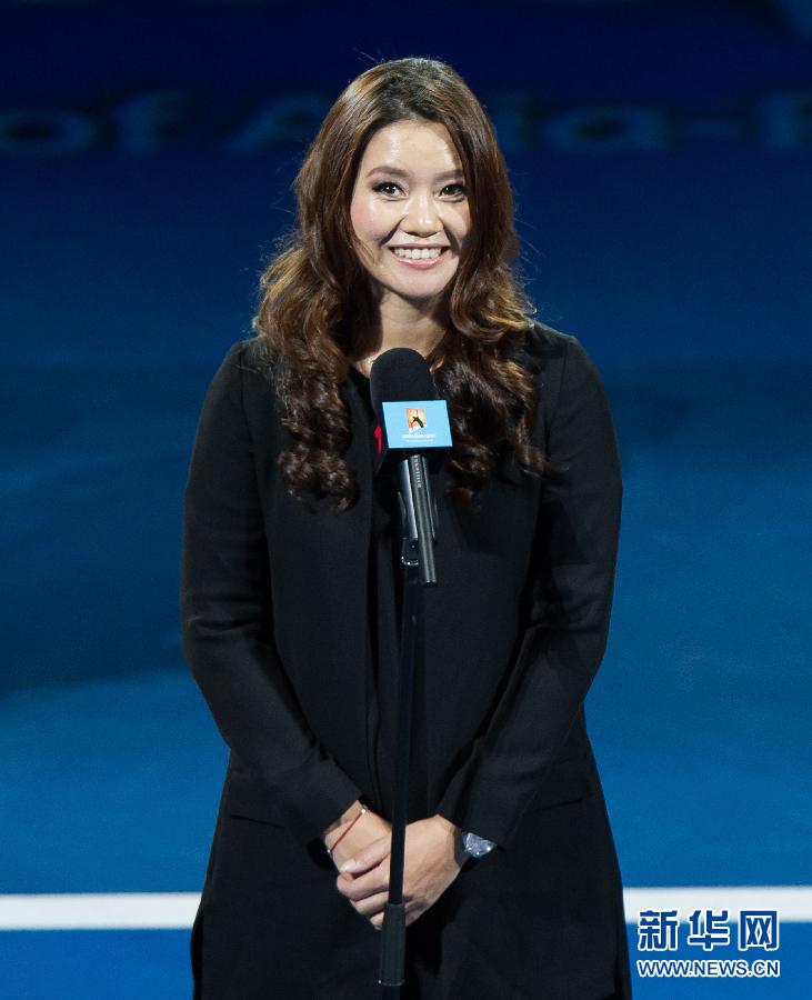 1月19日,李娜在退役仪式上发言。当日,澳大利亚网球公开赛组委会为上届澳网女单冠军李娜举行了简短的退役仪式。在仪式上,李娜与现场观众分享了自己怀孕的喜讯。新华社发(白雪摄)