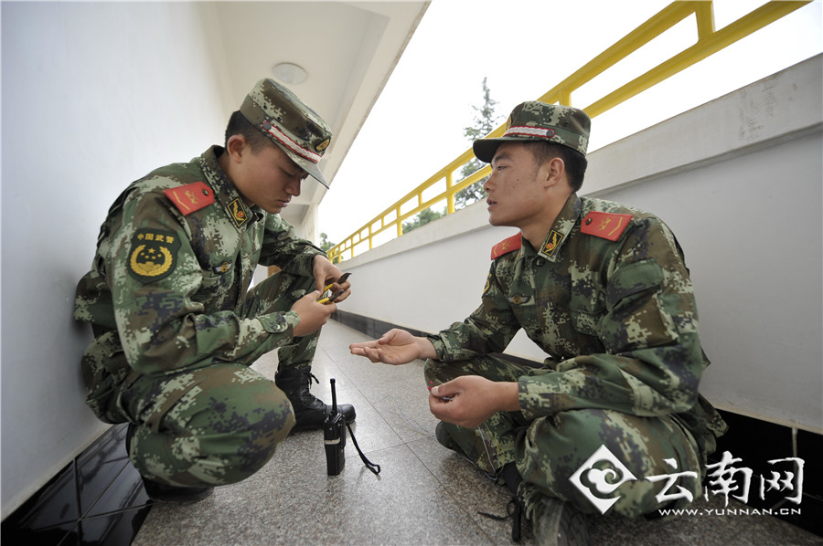 两名武警排爆手休息时在一起聊天,排爆队员们性格都比较内向,特殊的职业决定了他们的性格。