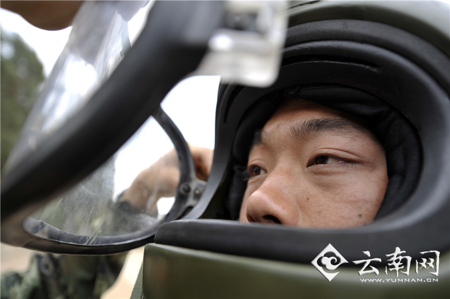 一名队员将一个防爆面罩戴在排爆手的排爆头盔上。