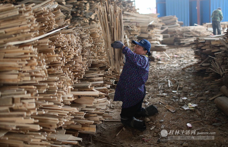 在工厂里胡凤莲把木条捆好后,堆放在一起。