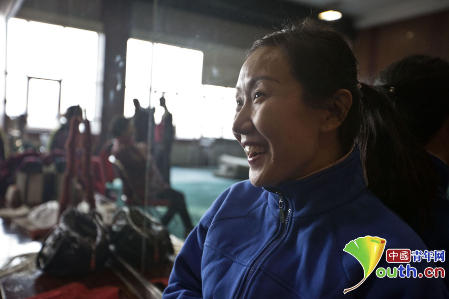 一出戏练完,潘月娇会坐下来调整一会。同时她也看着正在练功的其他演员,并与他们不断交流。 中国青年网记者 李拓摄
