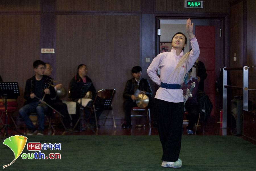 潘月娇正在“响排”《盗仙草》。“响排”是在有乐队伴奏的条件下把一出戏从头到尾进行排练。 中国青年网记者 李拓摄