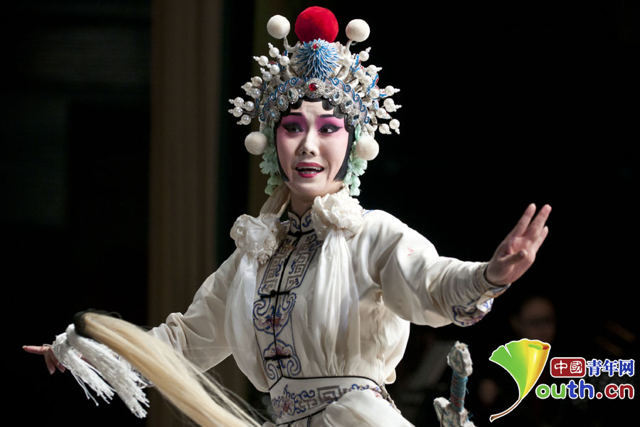 演出正式开始,潘月娇手持拂尘,在舞台上饰演京剧《盗仙草》中白娘子一角。为了这场演出,从两个月前开始,潘月娇带着膝上旧伤,缠着绷带,起早贪黑地练功。中国青年网记者 李拓摄