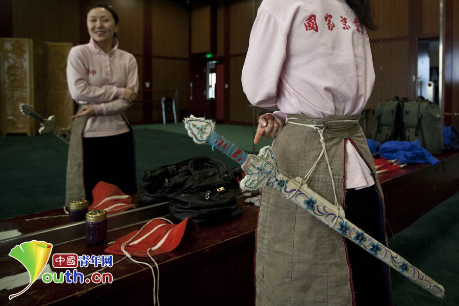 潘月娇指着自己腰上的佩剑告诉记者,这把剑是自己的老师当年在台上用过的,剑的岁数可能比自己都大。 中国青年网记者李拓摄