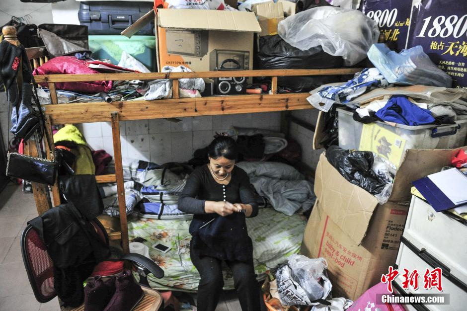 王书伟在家中打毛衣。她的家更像是一个仓库,九年下来,已经堆满了王书伟认为仍有价值的废品,在她眼中,所有东西都有价值,所有时间都应该用来工作。中新社发 陈骥旻 摄
