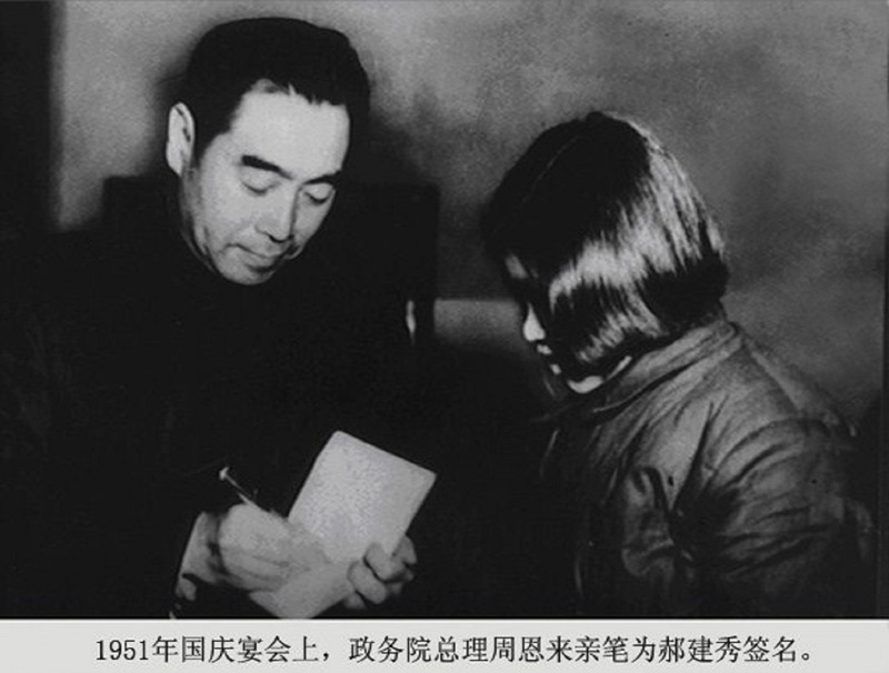 1951年,国庆宴会期间,周恩来总理为青岛纺织工人杰出代表郝建秀签名留念。(资料)