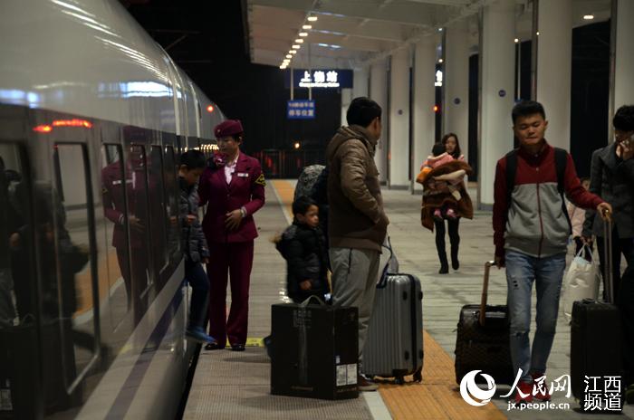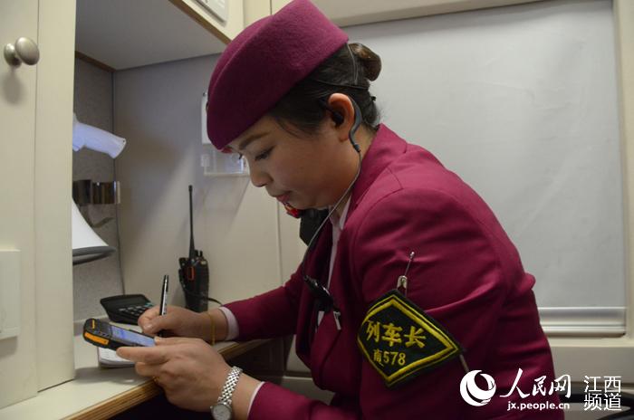 上饶站到了。确认旅客下、上完毕后,张莉通过对讲机告知司机可以开车。