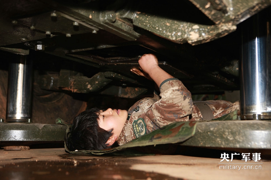 某部女子导弹连陈宇妍钻到车底进行装备维修。吴忠勇摄