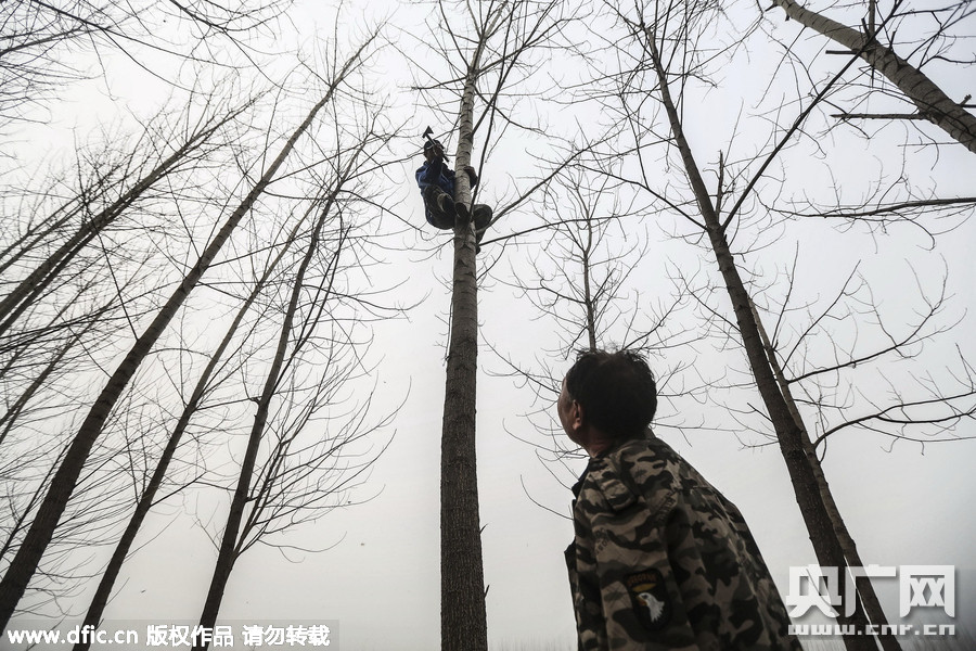 等贾海霞到树上,贾文其则在树下告诉他树枝的确切位置,贾海霞再掏出斧头砍下树枝。