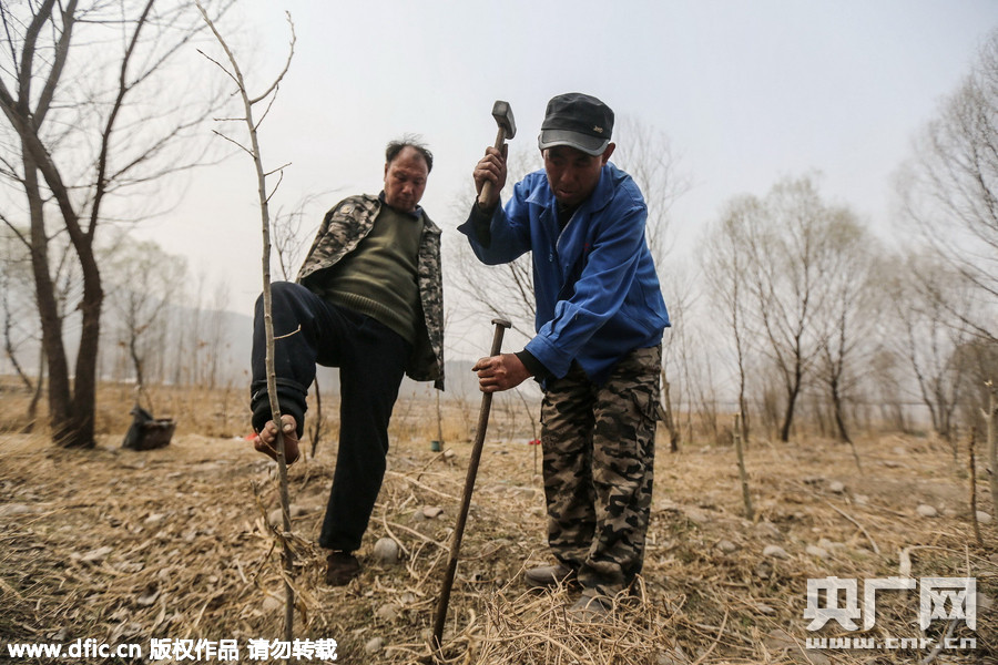 由于荒滩上全是石块,哥俩想出用钢筋打孔再种树的办法。由于双目失明,贾海霞只能凭感觉挥动铁锤,经常将自己左手砸破。