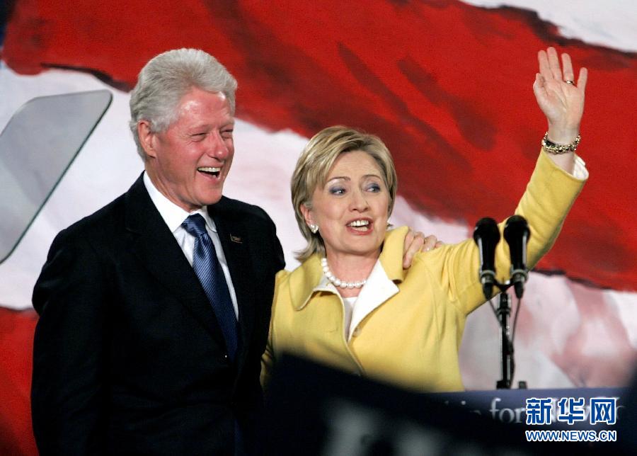 这是2006年11月7日,希拉里·克林顿(右)在美国纽约连任参议员后与丈夫、美国前总统比尔·克林顿拥抱。 新华社/法新