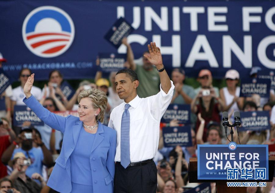 这是2008年6月27日,已获美国民主党总统候选人提名资格的奥巴马(右)和昔日竞争对手希拉里·克林顿在新罕布什尔州小城尤尼蒂(“尤尼蒂”在英文中意为“团结”)举行联合竞选集会。奥巴马和希拉里在当日的竞选集会上共同呼吁民主党人团结一致,力争取得大选的胜利。新华社/路透