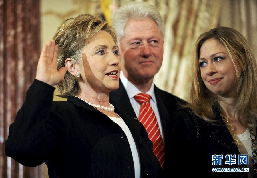 这是2009年2月2日,在美国首都华盛顿,希拉里·克林顿(左)在丈夫、美国前总统克林顿(中)和女儿的陪伴下宣誓就任美国国务卿。新华社/路透