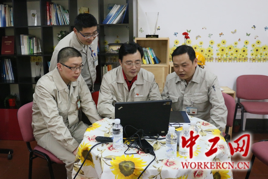王军在创新工作室与业务骨干探讨装备技术改造相关问题。中工网记者 王莹摄