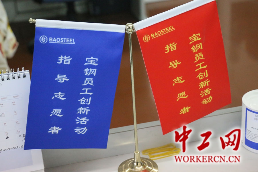 王军办公桌上的“宝钢员工创新活动指导志愿者”小旗。中工网记者 王莹摄
