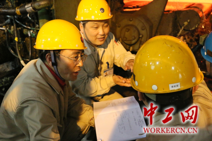 全国劳模、上海宝钢高级技师王军在一线生产车间与同事进行讨论。中工网记者 王莹摄