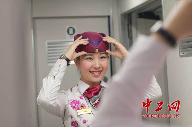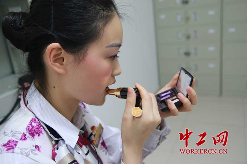 图为动妹田娇整理妆容,把最好的一面展现给乘客。古莎 摄