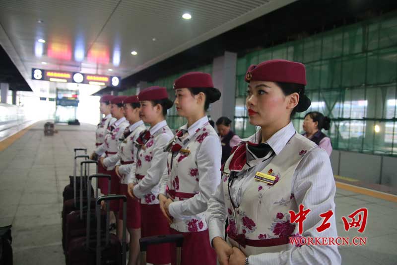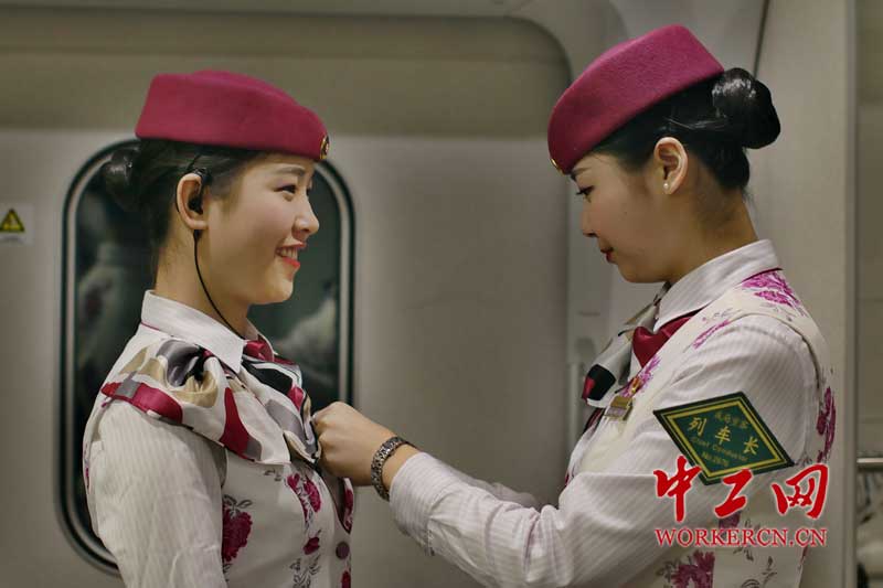 图为列车长王希露给田娇整理妆容。古莎 摄