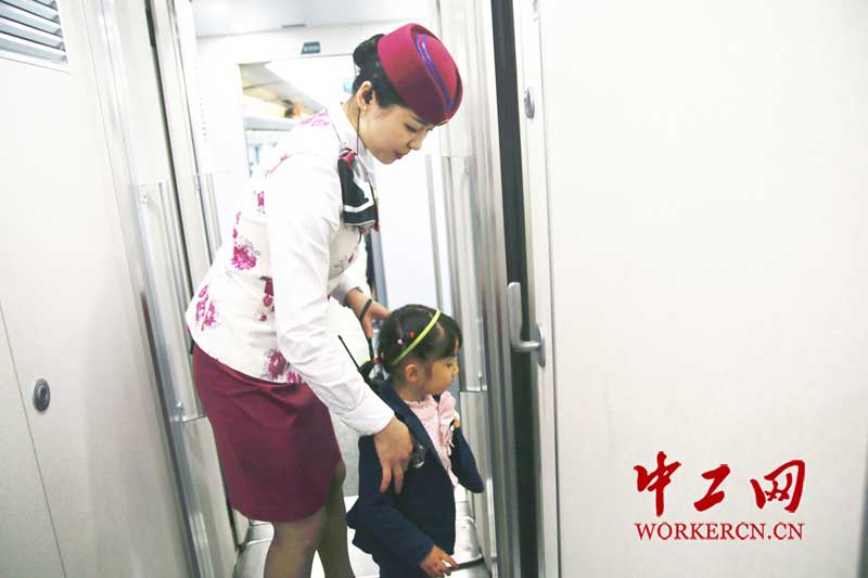 图为列车长王希露带小朋友进入洗手间。古莎 摄