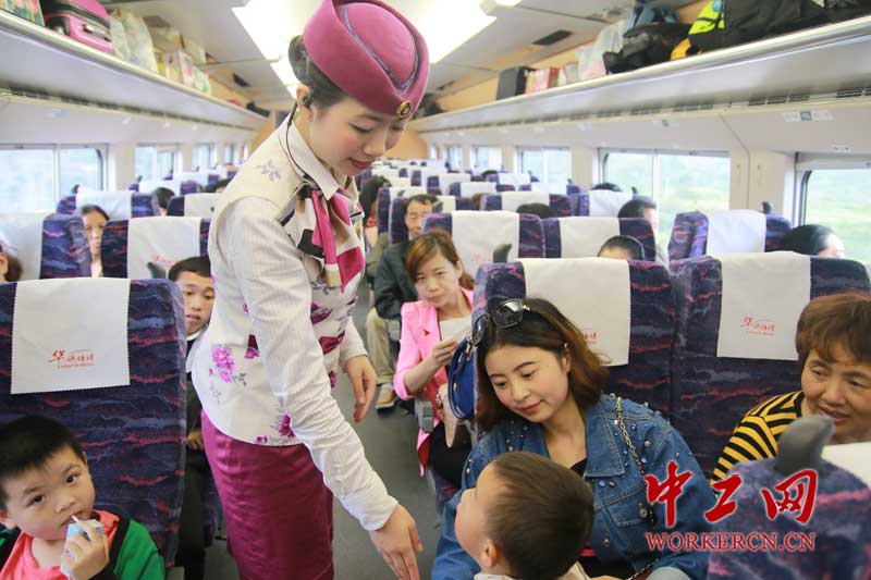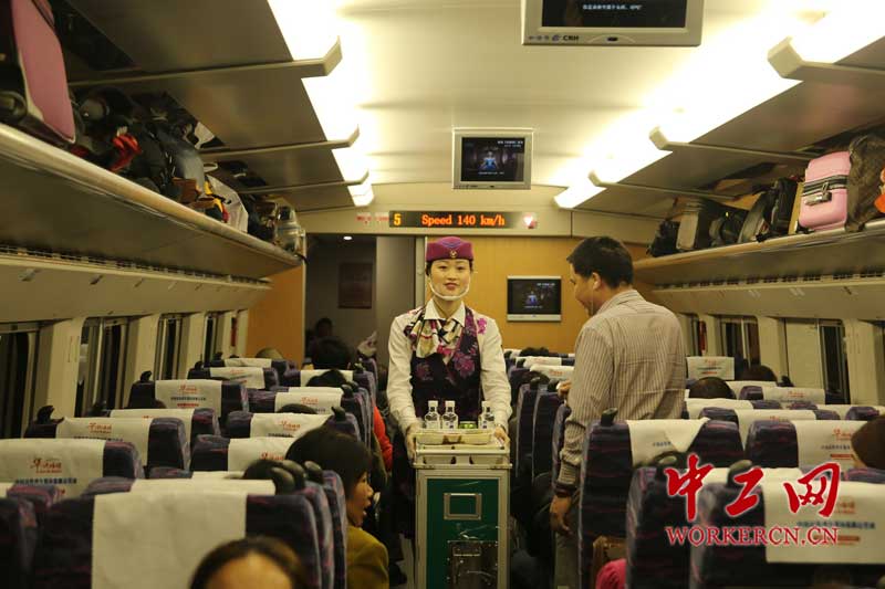 图为动妹张丽莎向旅客提供送餐服务。古莎 摄