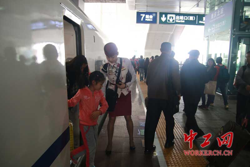 图为列车长王希露搀扶小女孩安全下车。古莎 摄