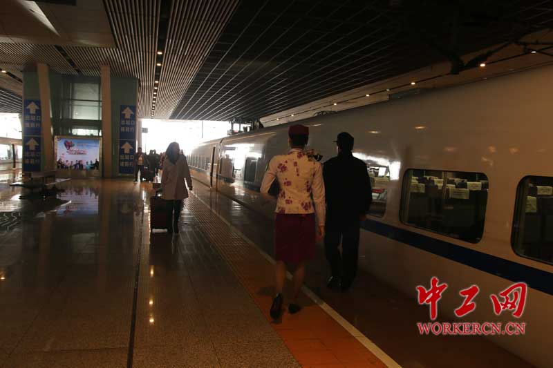 图为列车长王希露与乘警一起巡视列车站台。古莎 摄
