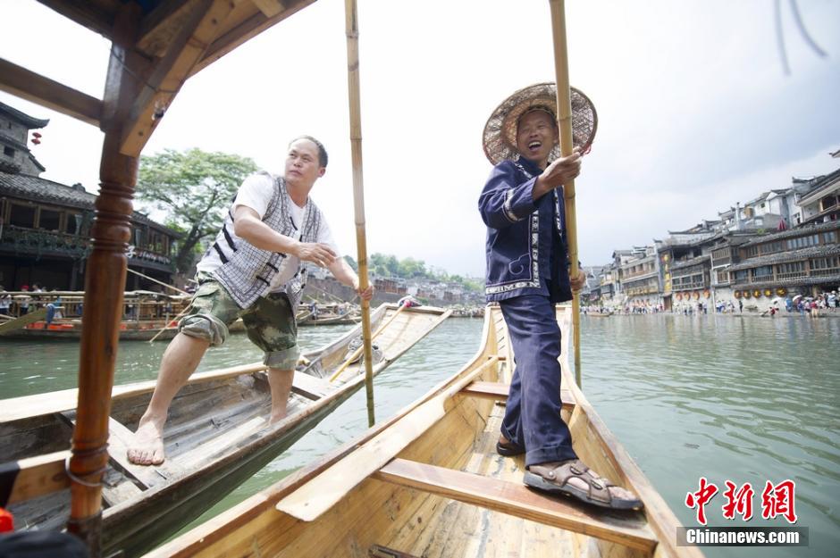 图为吴天送(图右)与工友一同开船。杨华峰 摄