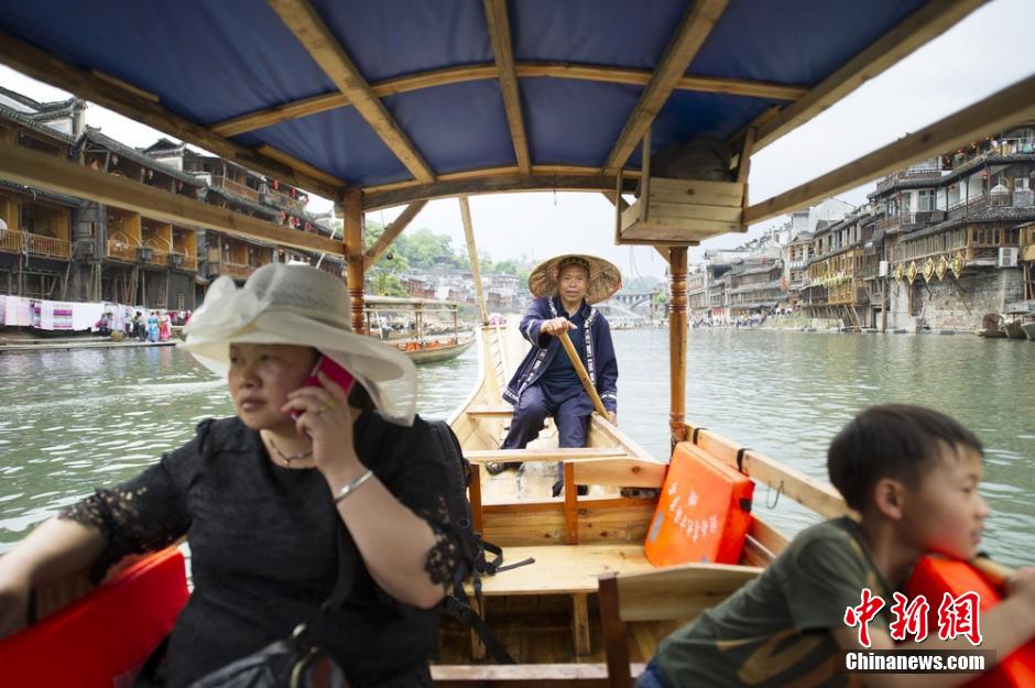 5月1日国际劳动节这一天,众多游客来到湖南凤凰古城游玩。尤其在沱江泛舟景点,游客排起长龙有序等待乘船游览美景。杨华峰 摄