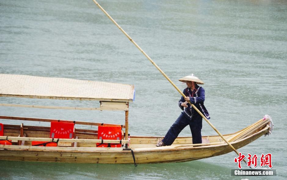 遇到短时阵雨,吴天送冒雨也要将船驶回起点。杨华峰 摄