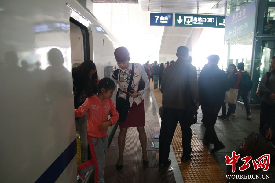 列车长王希露搀扶小女孩安全下车。古莎摄影