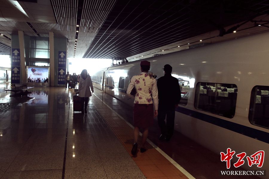 列车长王希露与乘警一起巡视列车站台。古莎摄影