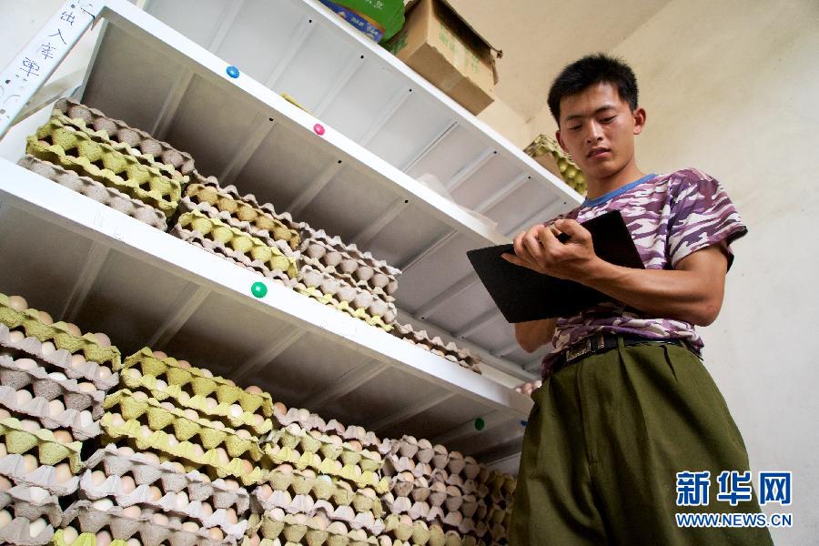 5月5日,刘湖滨清点即将出货的鸡蛋。新华社记者 胡晨欢摄