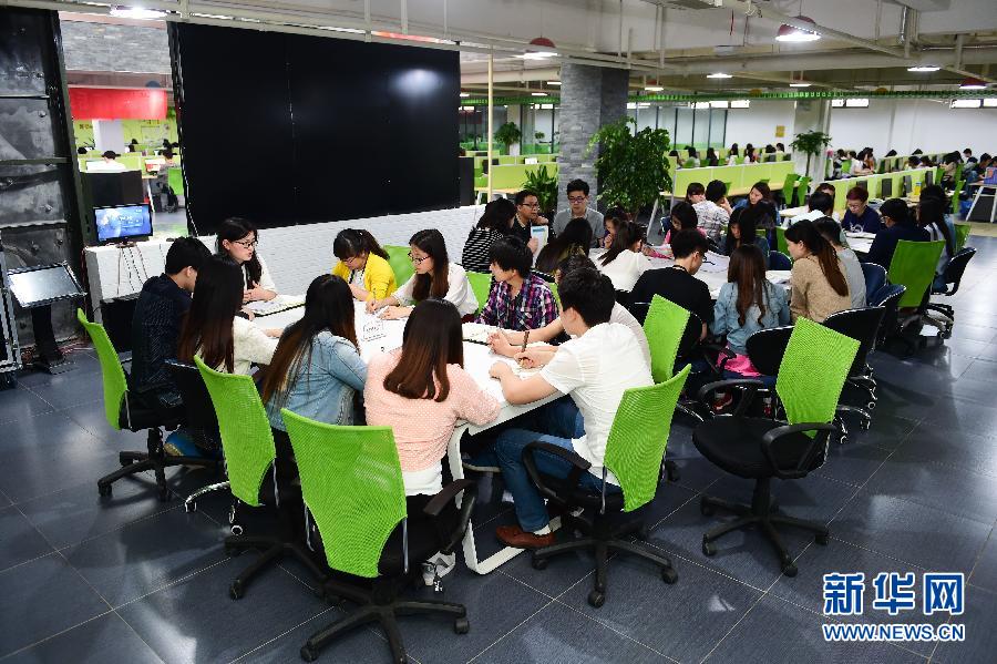 5月5日,“三只松鼠”的客户满意中心,工作人员在开会。新华社记者 杜宇 摄
