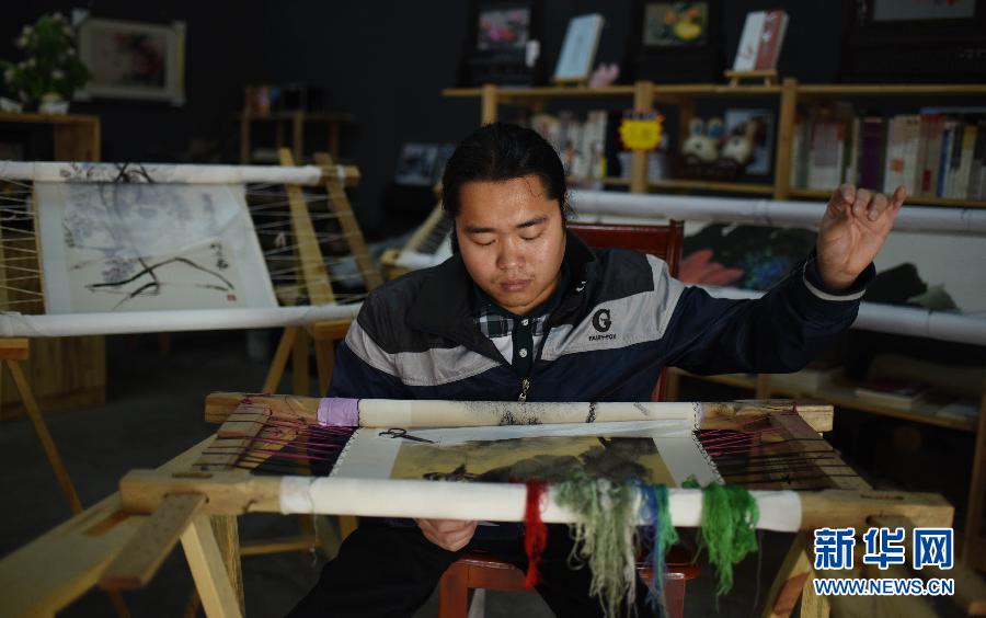 蒋桐万在自己的“御绣如意”绣庄里创作作品(3月27日摄)。26岁的蒋桐万毕业于湖南工艺美术职业学院湘绣设计与工业专业,他和班上的几名男生是该学院培养出的第一批“绣哥”。2014年毕业后,蒋桐万和同学黄进煜一起在长沙靖港古镇创办了“御绣如意”绣庄,通过现场刺绣展示、销售自己和同学创作的作品。创业第一年,绣庄销售额就超过10万元;目前,蒋桐万的一件作品最高可以卖到两万元。他希望绣庄能吸引更多同学和湘绣艺人来此展示销售,最终成为湘绣人创业和展示的场所。从2010年教育规划纲要颁布以来,职业教育在多个领域取得巨大突破和进展,进入了黄金发展期。5年来,职业教育共培养了5000万名中高级技术技能人才,1.33万所职业院校开设了近千个专业、近30万个专业点,基本覆盖了国民经济建设的各个领域。 2014年6月,国务院召开全国职业教育工作会议,印发了《关于加快发展现代职业教育的决定》,提出以培养技术技能人才为目标,到2020年形成具有“中国特色、世界水平”的现代职业教育体系。近年来,高职毕业生就业质量持续提高,毕业半年后就业率达到90%,且毕业生月收入增长“跑赢”通货膨胀;中职的就业率更是连续9年保持在95%以上。越来越多的职业学校学生,在走出校门后成为社会“高薪族”。新华社记者李尕 摄