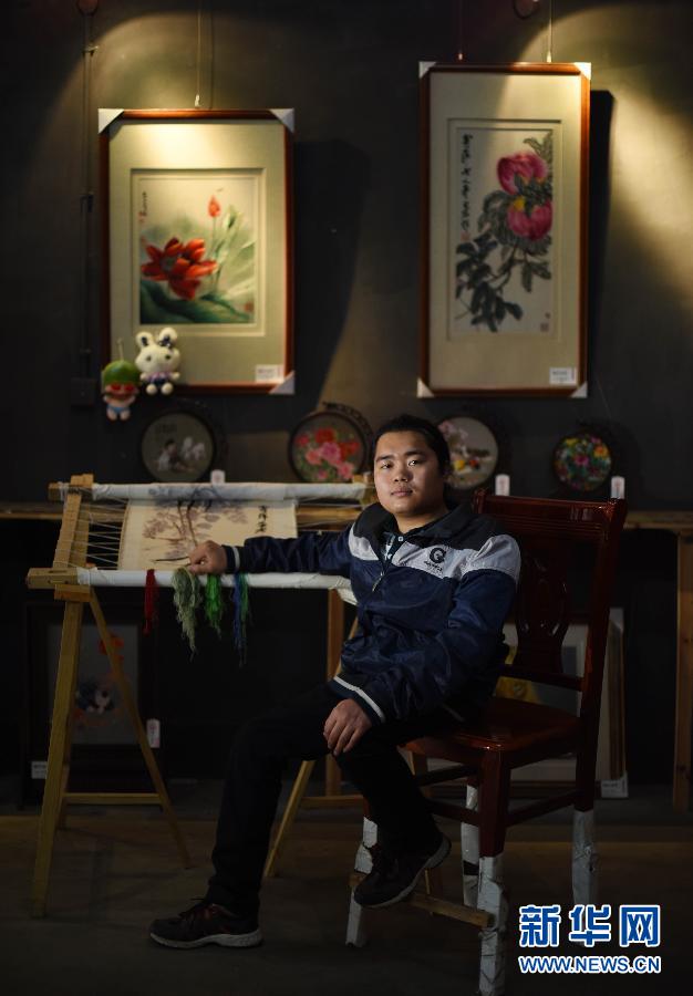 这是在“御绣如意”绣庄拍摄的蒋桐万(3月27日摄)。26岁的蒋桐万毕业于湖南工艺美术职业学院湘绣设计与工业专业,他和班上的几名男生是该学院培养出的第一批“绣哥”。2014年毕业后,蒋桐万和同学黄进煜一起在长沙靖港古镇创办了“御绣如意”绣庄,通过现场刺绣展示、销售自己和同学创作的作品。创业第一年,绣庄销售额就超过10万元;目前,蒋桐万的一件作品最高可以卖到两万元。他希望绣庄能吸引更多同学和湘绣艺人来此展示销售,最终成为湘绣人创业和展示的场所。从2010年教育规划纲要颁布以来,职业教育在多个领域取得巨大突破和进展,进入了黄金发展期。5年来,职业教育共培养了5000万名中高级技术技能人才,1.33万所职业院校开设了近千个专业、近30万个专业点,基本覆盖了国民经济建设的各个领域。 2014年6月,国务院召开全国职业教育工作会议,印发了《关于加快发展现代职业教育的决定》,提出以培养技术技能人才为目标,到2020年形成具有“中国特色、世界水平”的现代职业教育体系。近年来,高职毕业生就业质量持续提高,毕业半年后就业率达到90%,且毕业生月收入增长“跑赢”通货膨胀;中职的就业率更是连续9年保持在95%以上。越来越多的职业学校学生,在走出校门后成为社会“高薪族”。新华社记者李尕 摄