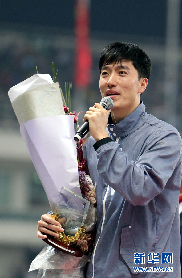 5月17日,刘翔在退役仪式上发言。当日,在国际田联钻石联赛上海站赛后,中国飞人刘翔的退役仪式在上海体育场举行。新华社记者凡军摄