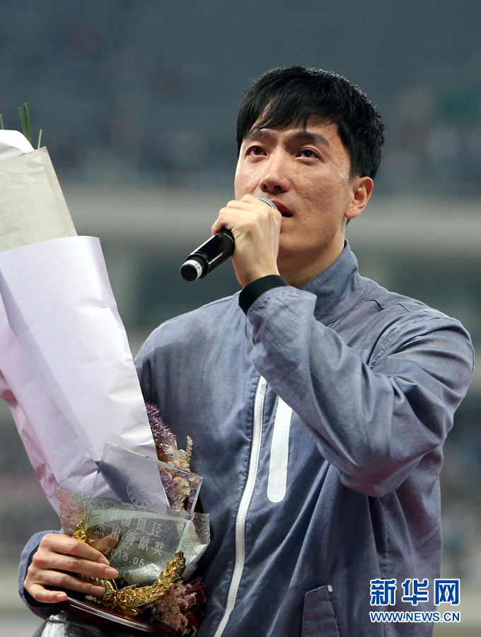 5月17日,刘翔在退役仪式上发言。当日,在国际田联钻石联赛上海站赛后,中国飞人刘翔的退役仪式在上海体育场举行。新华社记者凡军摄