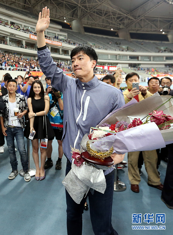 5月17日,刘翔在退役仪式上挥手告别。当日,在国际田联钻石联赛上海站赛后,中国飞人刘翔的退役仪式在上海体育场举行。新华社记者凡军摄
