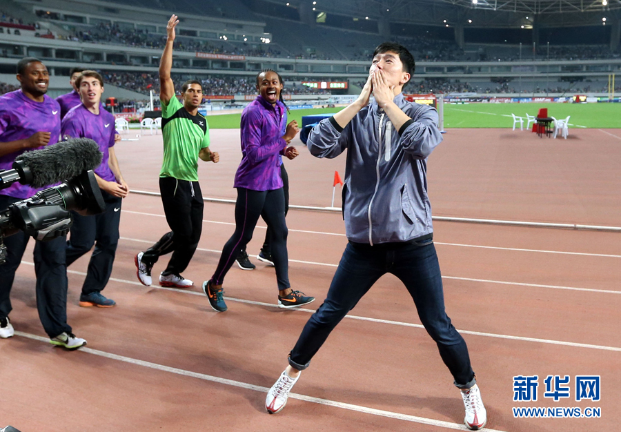 5月17日,刘翔在退役仪式上向观众致意。当日,在国际田联钻石联赛上海站赛后,中国飞人刘翔的退役仪式在上海体育场举行。新华社记者凡军摄