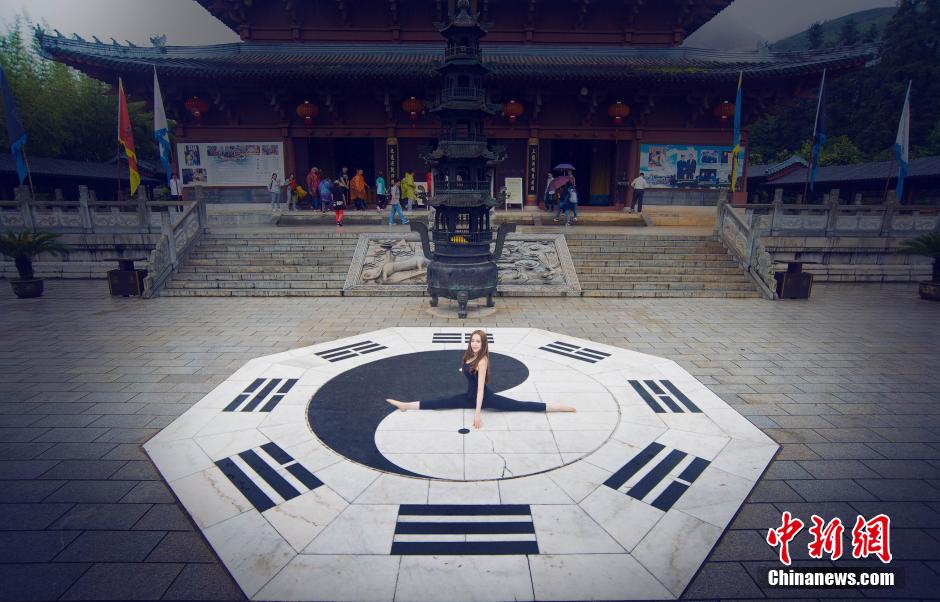 5月19日中国旅游日当天,因姣美面容和惊人柔韧度走红网络的北体校花付佳美现身江西省龙虎山景区“学艺”,和龙虎山的道长一起,有模有样地打起了太极拳,并在天师府、正一观、仙水岩等龙虎山景点大秀高难度瑜伽动作,上演标志性的“一字马”,引来不少游客围观。余锴 摄