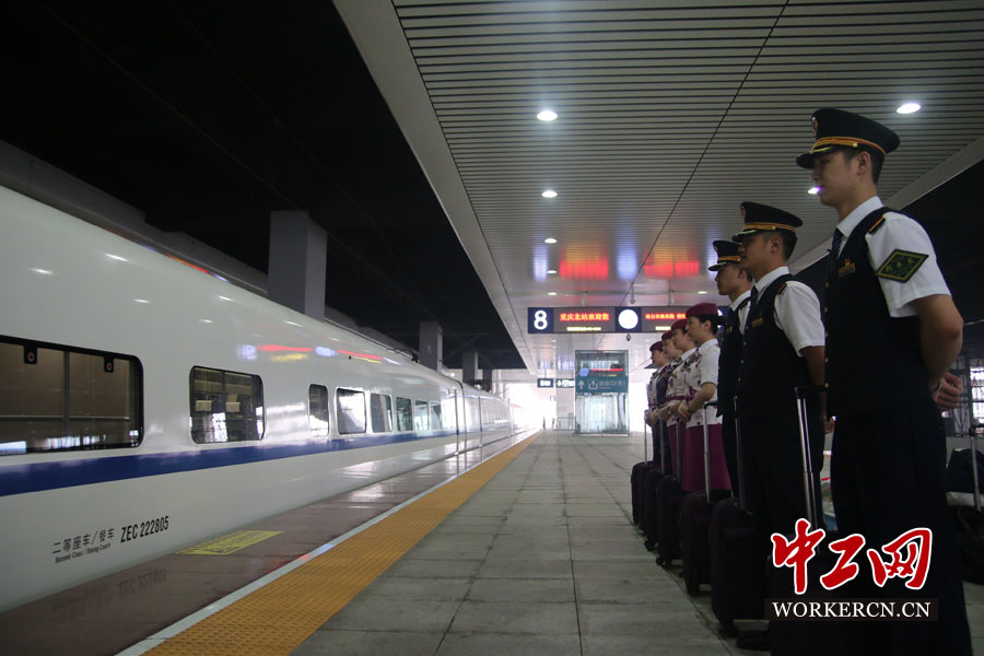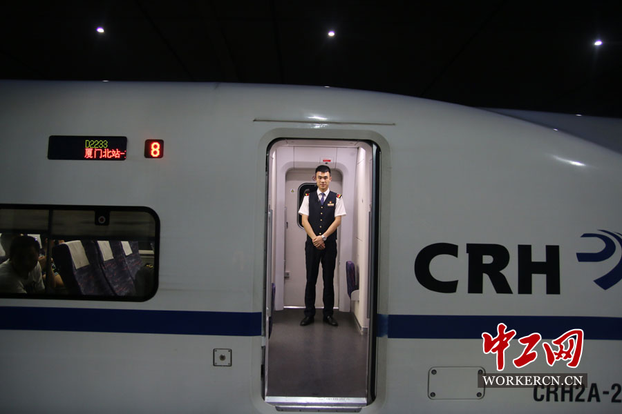 列车发车前,动少唐诚站在自己的岗位上,微笑着等待发车指令。
